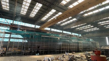 C’est sous ces colonnes dédiées à la naissance de grands navires que des grands spécialistes, par centaines, mettent leurs meilleures compétences au profit du grand Navire qui prend forme sous leurs gestes précis. Un retour en arrière de quelques mois dans la construction du premier voilier-cargo moderne #ClassePhénix chez Piriou Romania à Giurgiu.